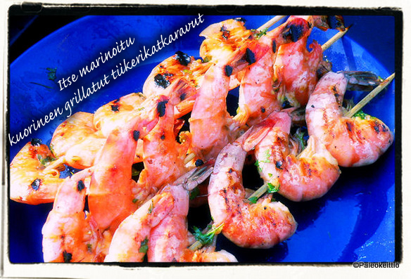 Marinoimme kaikki ruoat itse. Kyllähän siinä hieman enemmän vaivaa saa nähdä kuin kaupan valmismarinadeissa lilluvissa grillituotteissa, mutta vaiva on ehdottomasti näkemisen arvoinen. Sopivasti suolaa. Suolaisuus on mulle usein ongelma. Eikä kemikaaleja vaan parempaa, aitoa ruokaa! Öljypohjana marinadeissa käytimme paistamiseen kookosöljyn ohella suosimaani avokadoöljyä. Paitsi tiikeriravut marinoin sitruunapohjaisessa kastikkeessa kokonaan ilman öljyä. Olivat muuten jättegoda! Kuten koko ateria =)