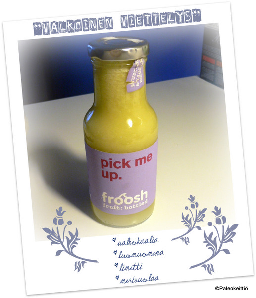 Joskus on vaan pakko saada jotakin. Tänään oli pakko saada mehua. Ongelmana oli vain raaka-aineiden puute. Sillä mennään, mitä on! Ja sillä mentiin, mitä oli! Kaalia, omenaa ja limetti mehustimeen. Tuloksena ”Valkoinen viettelys”. Ei yhtään niin keltainen kuin kuvassa. Eikä välttämättä kovin vietteleväkään. Sillä eihän se mikään maailman mahtavin mehu ollut. Mutta mehua kuitenkin. Tuoretta ja terveellistä. Se riitti tänään tyydyttämään äkillisen mielitekoni. Piste.