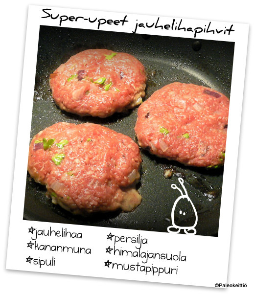 Super-nopeet jauhelihapihvit syntyvät kädenkäänteessä. Paitsi nopeasti, niin myös yksinkertaisesti. Vielä nopeammin pääset, jos jätät sipulit kuullottamatta. Mä en pidä rouskuvista sipulinpalasista mun jauhelihapihveissä, joten tavallisesti kuullotan ne kookosöljyssä ennen taikinaan lisäämistä.