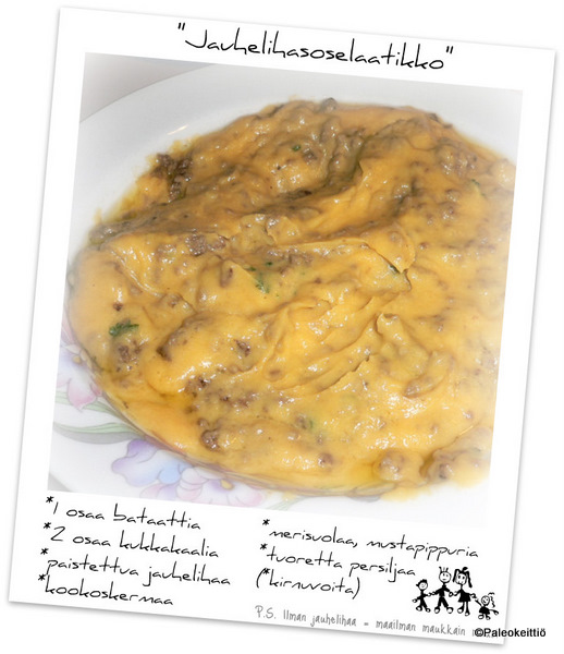 Tämä herkku toimii aivan loistavasti ihan sellaisenaan. Jääkaapissa oli valmiiksi paistettua karitsanjauhelihaa, jonka tuuppasin mukaan lautaselle. Sekoitin ja söin. Vanhaa kunnon jauhelihasoselaatikkoa. Uudelleen lämmitettynä. Pohjana kukkakaali-bataattimuusi.