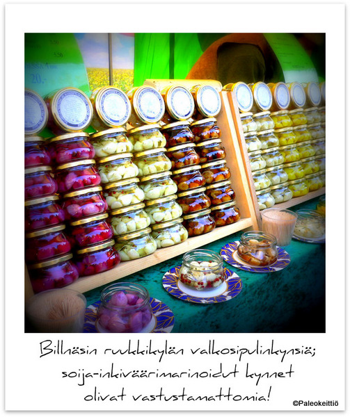 Kuvia tuli markkinoilta napsittua kivasti, joten enpä tarjoile tämän enempää aiheesta tekstiä vaan annan kuvien puhua puolestaan. Sen verran vielä mainittakoon, että kotio markkinoilta lähtivät marinoidut valkosipulinkynnet kera sokeroimattoman, kylmäpuristetun supermarjamehun ja -jauheen. Saaristolaislimppu olisi joutanut pakastimeen, mutta se ehti loppua ennen kuin ostoksille asti pääsin. Kohtalon ivaa. Kai ;)