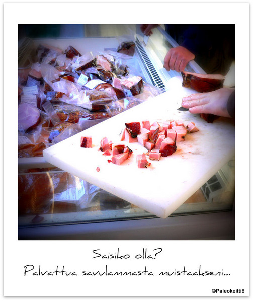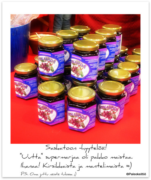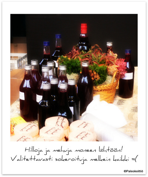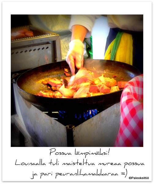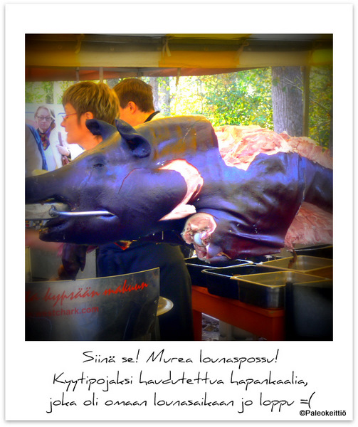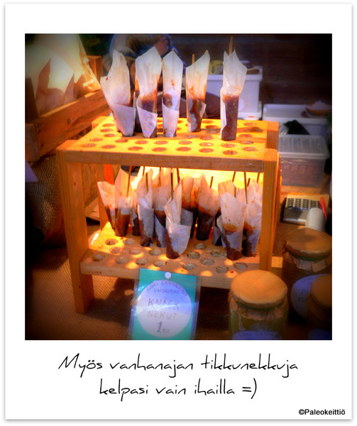 Synttäreistä selvisin kunnialla, mutta lähiruokamarkkinoilla tuli kyllä maisteltua kiellettyjäkin herkkuja. Hyvin pienissä määrin, mutta kumminkin. Hillonokareet ja pari pikkuista leipäpalaa hyväilivät makuhermoja. Lounaaksi nautin kuitenkin sääntöjen mukaisesti parit peuramakkarat ja kaverin lautaselta maukasta, suussasulavan pehmeää varraspossua. Harmitti, kun en itse possuun päätynyt. Aikomus oli, mutta jotenkin siinä mustaa sikaa silmiin tuijottaessa oli helpompi tarttua makkaraan. Lisukkeena toiminut haudutettu hapankaali ehti valitettavasti loppua. Jätimme kuitenkin molemmat suosiolla hapankaalin korvikkeena tarjotut perunalimput muille. Iltapäiväkahvikin tuli nautittua lorauksella kermaa. Hyvä niin, sillä se oli maukkainta kahvia, jota olin saanut pitkään aikaan! Vaikka ihan vaan paperimukista tulikin hörpittyä.