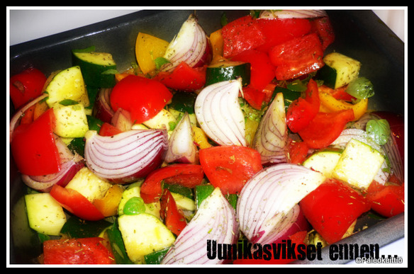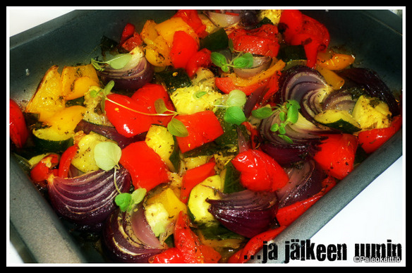 Uuniin matkasivat tällä kertaa punasipuli, punainen ja keltainen paprika sekä kesäkurpitsa. Päälle runsaasti avokadoöljyä. Mausteena tuore oregano, kuivattu Provencen yrttisekoitus ja suola. Melko herkkua!