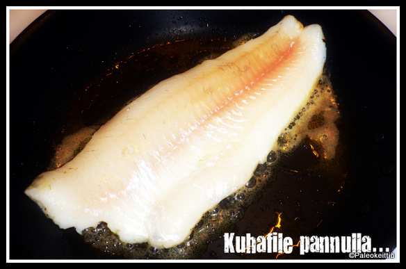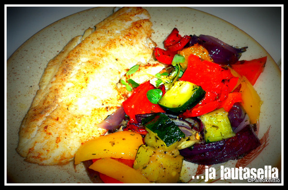 Voissa paistettu kuhafile uunikasvisten kaverina. Kala maustettu tuttuun tapaan merisuolalla, valkopippurilla ja sitruunalla.