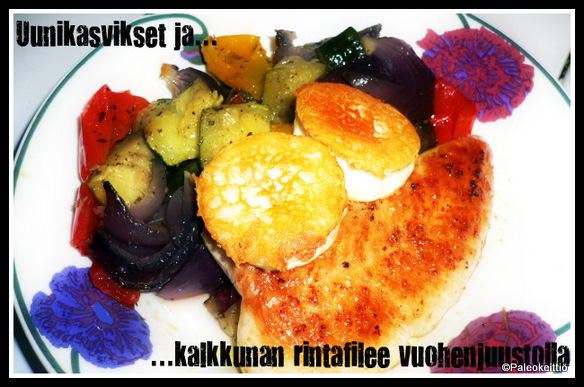KotiGourmeeta parhaimmillaan! Pannulla paistettu kalkkunan rintafile tuoretiskiltä, uunikasviksia ja aterian kruununa pari siivua paistettua vuohenjuustoa. Kalkkunan mausteena suola ja sitruunapippuri. Kuin ravintolaruokaa söisi!