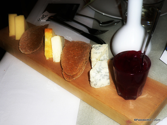 Koska olimme tilanneet kokonaisen punaviinipullon, josta oli vielä pääruoan jälkeen reippaasti yli puolet jäljellä, päätimme tilata vielä väliruoaksi juustolautasen viinin kaveriksi. Juustolautaselta löytyi suomalaisia perusjuustoja; Auraa, Pitoa(?) ja Emmentalia. Mieto pito munajuusto nousi omaksi suosikikseni, vaikka yleensä pidän vahvoista juustoista. Ehkä viinivalinta ei vain osunut tällä kertaa näiden vahvempien juustojen kanssa yksiin. Juustojen kanssa tarjoiltu karviashillo oli loistavaa! Tämän juustolautasen pelastus =)