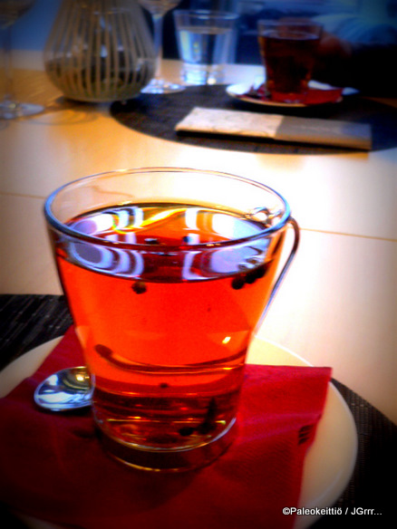 Olin katsonut omat valintani valmiiksi netistä ja suurin pettymys syntyikin, kun valmiiksi miettimääni alkuruokaa ei ollutkaan tarjolla. Piti olla, mutta ei ollut, kuului selitys. Selvä! Alkuruoat sikseen! Muu seurue aloitteli alkoholittomalla vaalealla glögillä. Minä valitsin reteesti perjantaipäivän kunniaksi pienen lasillisen luomupunkkua. Se kun sattui sopivasti sopimaan myös pääruokani palan painikkeeksi =)