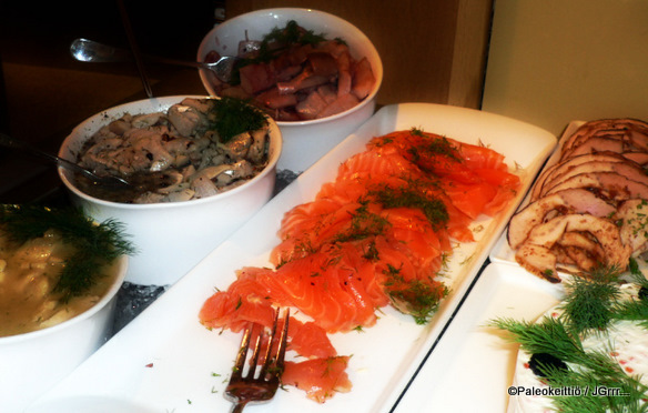 Puolet seurueesta valitsi pääruoaksi joulupöydän. Itselleni ei pöydästä löytynyt oikein muuta aidosti mieleistä kuin rosolli, joten jätin jouluherkut sikseen. Joulupöydässä oli tarjolla pääasiassa erilaisia kalavaihtoehtoja; silakoita, sokerisuolattua lohta ja katkarapumätikakkua. Lisäksi jo mainitsemani rosolli ja riistaterriiniä. Perunat tuotiin erikseen lämpiminä pöytään.