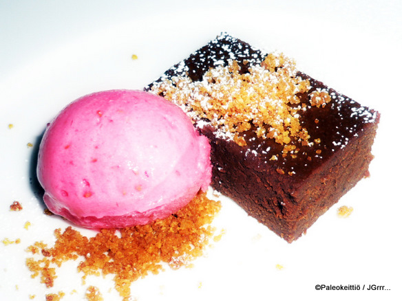 Jälkkäriksi valitsin aivan ylihyvältä kuulostavaa taatelisuklaakakkua kera vaniljasorbettipallon. Sorbetti ei vaan ollutkaan valkoista vaniljaa vaan punaista vadelmaa. Noh, onhan niissä sentään samat alkukirjaimet. Jälleen pieni pettymys. Hmph! Ja jotenkin odotin jälleen jotain todella suklaista kakkua, joka osoittautui kuitenkin enemmän makeaksi kuin suklaiseksi. Tässä asiassa vika taitaa tosin olla maistajassa. Kun on tottunut runsaskaakaoisiin tummansuklaan makuihin, niin moni suklaalla nimetty annos jää vaisuhkoksi. Ihan ok kakkupala kuitenkin, johon oli hyvä päättää jouluinen lounas parhaassa seurassa.