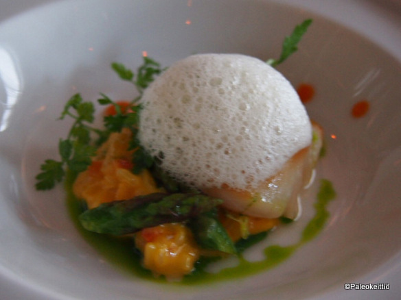 Seuraavaksi saimme eteemme kampasimpukoita. Sain vihdoinkin maistaa tätä kauan himoitsemaani herkkua! Kampasimpukka kävi siis ekaa kertaa ever mun suussa ja pidin kyllä. Lisäkkeenä porkkanarisottoa, valkoista vaahtoa ja vähän vihreää. Oikein makoisaa!