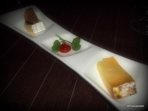 Väliruoaksi juustolautanen. Brietä ja jotain muuta. Harmittaa, että unohdin kysyä mitä. Oli sopivasti vahvuutta ja makua. Vain aterimet puuttuivat! Kuten myös lautasliinat. Miinusta tuli myös shampanjalaseista, jotka tuntuivat omituisen muovisilta. Laadukkaammilla olisi ollut mukavampi kilistellä. Juuh, pikkujuttuja, mutta pikkujuttujen olettaisi olevan kunnossa fine dine -ravintolassa, jossa ruoka yltää kuitenkin ihan huipputasolle. Noh, sainpas taas jotain kitisemisen aihetta ;D