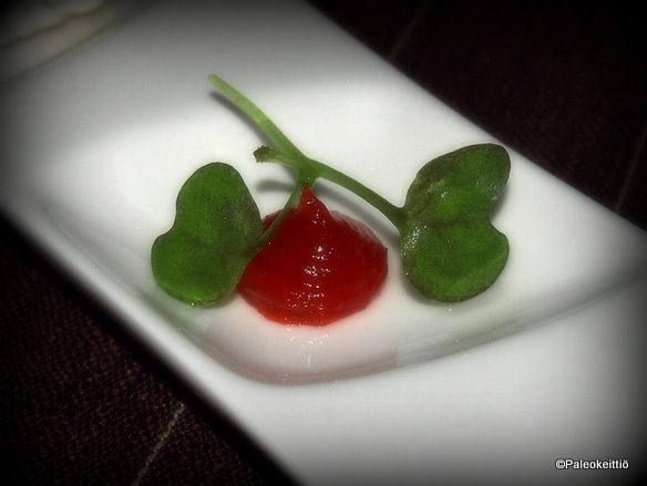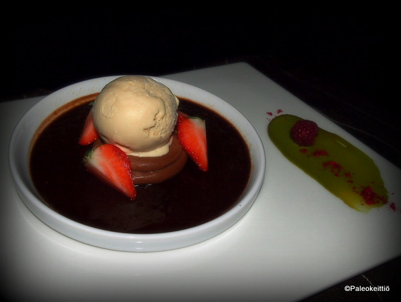 Jälkkäri oli…. OMG! Täysi kymppi ja sitä oli kerrankin riittävästi! Tiukka paleopipo olisi tietystikin skipannut tämän osuuden, mutta mulla ei suklaan suurena ystävänä olisi kuuna päivänä riittänyt siihen selkärankaan. Tuota vihreää komeettaa vadelmalla veikkasin pistaasitahnaksi, mutta saatan olla täysin pois polulta. Pääasia oli kuitenkin bruleemainen suklaavanukas ja kahvijäätelöpallo. Mansikkakin maistui! Tuossa suklaavanukkaassa oli siis rapeaksi paahdettu sokerikuori, jonka alla pehmeää (kermaista?) suklaavanukasta.
