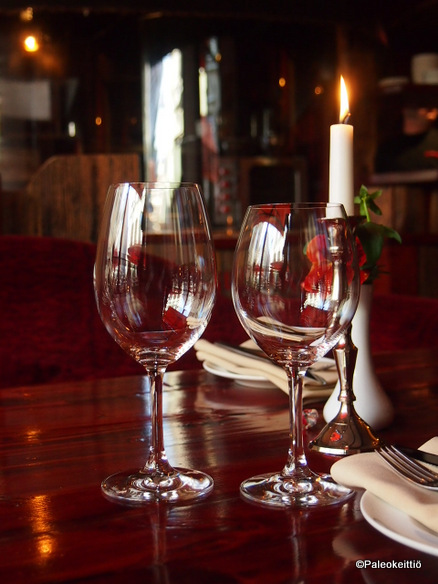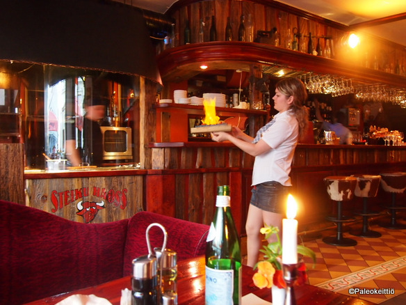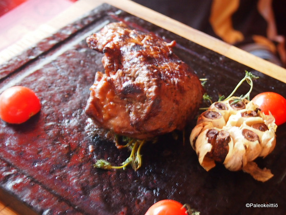 Kaverille maistui hippasen isompi pala samaa tavaraa; rommiliekitettyä naudanfilettä eli Flambè Steak. Raakana. Annos tarjoillaan kuumalla kivialustalla, jossa liha jatkaa kypsymistä vielä paistamisen jälkeen. Mukana sellainen pikkuerikoisuus kuin paistettu (?) valkosipuli. Ja koska jälkkärit jätettiin väliin, niin ainakin ensimmäinen ateria sujui kutakuinkin paleo-oppien mukaan. Tosin sienikeiton sisällöstä ei ole hajuakaan ja uskon hyvin vahvasti keiton olleen lämmitettyä valmissapuskaa. Miksi? Stay tuned! Se selviää myöhemmin, kunhan Riikan reissu etenee =)