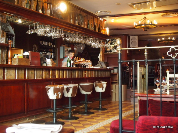 Tällä kertaa se oli länkkärimäinen pihvipaikka Steiku Haoss (Audeju iela), jossa saimme keskinkertaista ruokaa ylihinnalla. Alkuruoaksi keittoa, pääruoaksi pihviä ja kyytipojaksi lasillinen punaviiniä sekä pullo kuplavettä – reippaat 60 latia eli ~90 euroa kahdelta, kiitos! Melko kallista. Samaan hintaan olisi saanut ihan kelpo aterian Suomessakin.