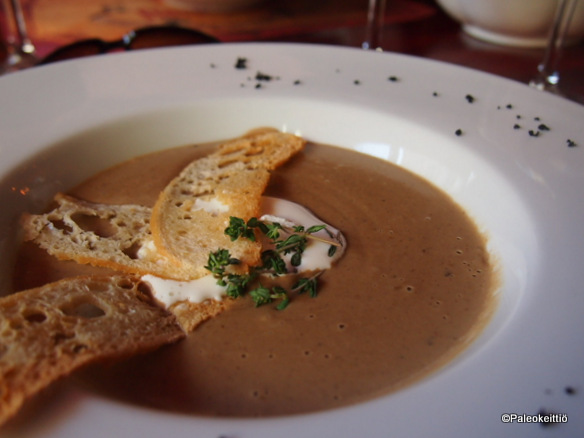 Alkuruoaksi molemmille kermaista metsäsienikeittoa sinihomejuustomoussella. Näytti hyvältä ja maistui ihan ookoolta. Tosin ensimmäinen kommenttini oli, että mistäköhän purkista tämä on lämmitetty. Ihan hyvää… purkkiruokaa. Ei siinä mitään. Sinihomejuustoa en annoksesta löytänyt, vaikka päällä jonkinlainen mousse lilluikin.