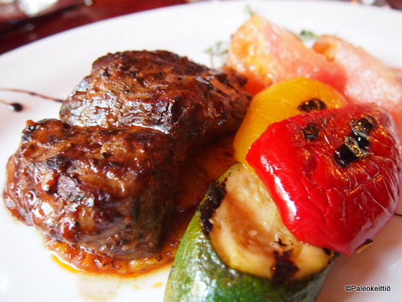 Pääruoaksi valitsin leidimäiseen tapaani sopivan sitkeän, parisataagrammasen palan härkää; Lady Steak, todennäköisesti naudan ulkofileestä. Kannattaa huomata, että paikassa tilataan lisukkeet ja kastikkeet erikseen. Näistä myös veloitetaan erikseen. Oiva tapa nostaa annoksen hintaa aivan vaivihkaa. Etenkin, jos valuutta on vielä hieman outo. Lisukkeeksi valitsin grillattuja kasviksia; tomaattia, kesäkurpitsaa ja paprikaa tupsahti viereen.
