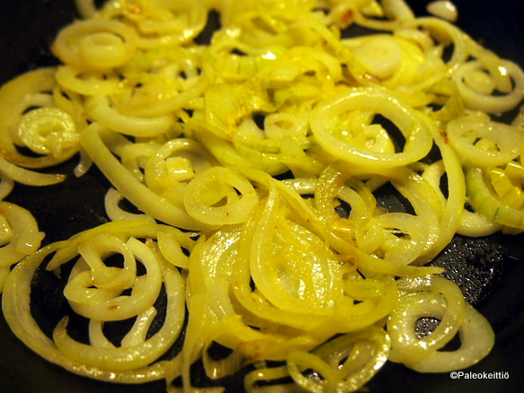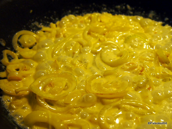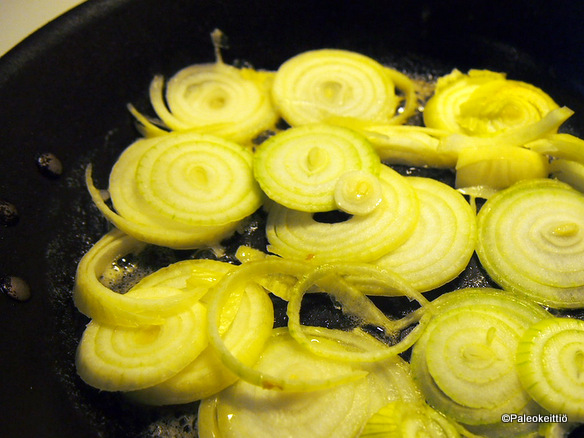 Renkaiksi viipaloidut sipulit pannulle aidon voin tai kookosöljyn sekaan. Itse taisin käyttää kirnuvoita.