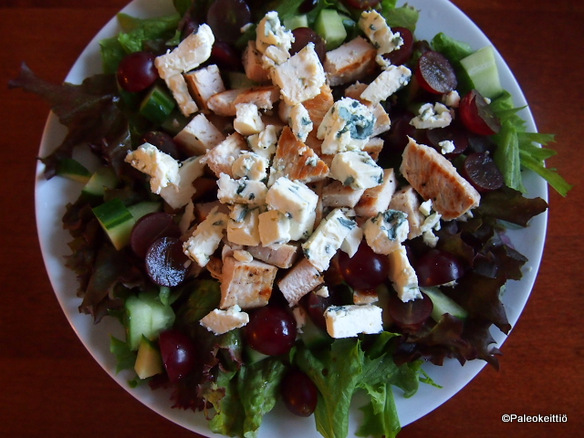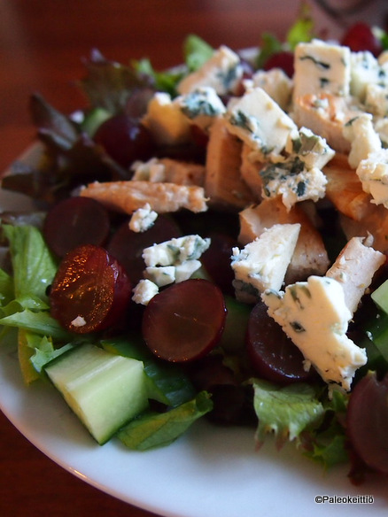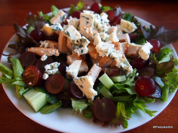 Saako olla salaatti? Näin vaihteeksi? ;D Salaatti päivässä pitää veden kielellä ja kesämielellä! Hippasen jo vaihtelua kuitenkin kaipasin perus tomaatti-kurkku-salaatti -comboon, joten sitä sitten Aura -juustosta ja viinirypäleistä hakemaan.