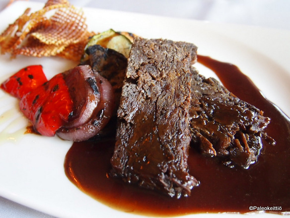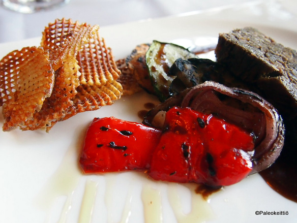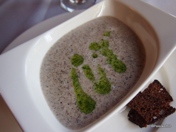 Alkuruokana oli kermaista korvasienikeittoa ja makeita mallaskrutonkeja. En tiedä, mitä tuo ”vihreä öljy” oli. Jonkin sortin yrttikastiketta kaiketi. Korvasieni on mulle suhteellisen uusi tuttavuus, mutta I love it! Hassua! Sienet kun olen kiertänyt yleensä kaukaa. Vähitellen vaan oppinut syömään, ja jopa pitämään niistä. Paleokeittiössä ei sieniä vielä kuitenkaan nähdä =D. Noh, korvasienikeitto on joka tapauksessa aina hyvää. Niin oli tämäkin, vaikka ei vetänytkään vertoja Långvikin vastaavalle.