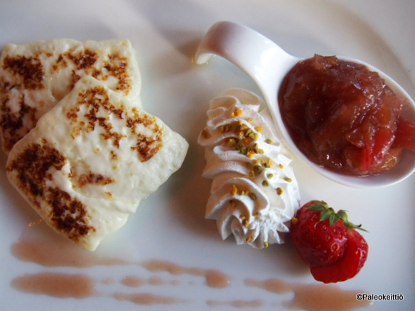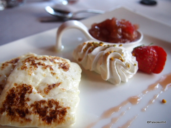 Save the best for last! Useimmiten valmiiden menukokonaisuuksien parasta antia ovat olleet alkuruoat. Tällä kertaa voiton vei jälkiruoka. Ihan mahtavaa! Ja mahtavaa myös siksi, että itse tuskin olisin tätä listalta valinnut. Koska suklaakakku on aina suklaakakku =D. Jälkkäriksi oli siis paistettua Veikkolan kotijuustoa (Veikkola on ”kylä” Kirkkonummella), raparperihilloketta ja siitepölyrakeilla koristeltua kermavaahtoa. Mieto kotijuusto sopi aivan loistavasti yhteen makeankirpsakan raparperihillon ja kermavaahdon kera. Delicious!