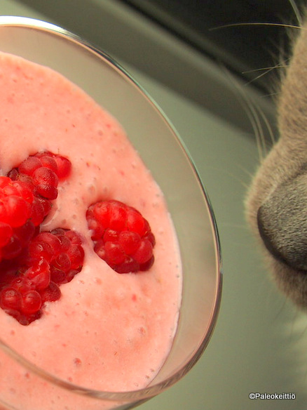 Mieluiten nautiskelen kefiirini kera Provena gluteiinittoman myslin. Pari kolme ruokalusikallista mysliä joukkoon hetkeksi turpoamaan. Tuoreita marjoja kruunuksi. Jos niitä sattuu olemaan. Vähemmän tuoreet olen heittänyt kefiirin kanssa tehosekoittimeen. Alla maukasta mansikkakefiiriä vadelmin, joka kiinnosti myös karvaisemman nenän omistajaa. Tai omistajia. Molemmat olisivat kai mielellään liponeet mun kefiiripirtelöt pienempiin suihin =D