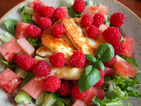 Vadelmia löytyy tänä vuonna hurjasti! Niistä on riittänyt paitsi naposteluun, pakastimeen ja jälkkäreihin, niin myös salaattiin suolaisen halloumin kaveriksi.