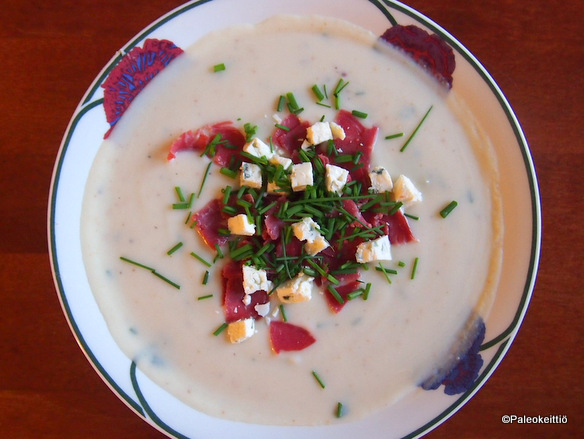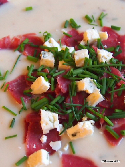Kukkakaali-savujuustokeiton resepti löytyy lehtisen lisäksi myös Pirkan ruokasivustolta. Jokseenkin näillä aineksilla mentiin. Oivariini tosin vaihtui kirnuvoihin ja poron kylmäsavupaisti kylmäsavuhärkään. Päälle ripottelin ruohosipulin lisäksi jääkaapissa jo aikansa eläneen palan Aura -juustoa.