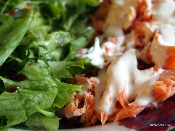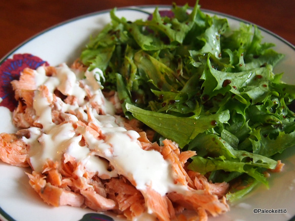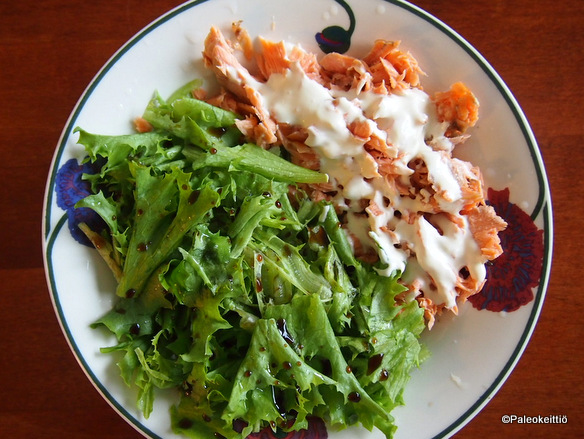 Vastaloimutettua lohta sitruunalla, smetanalla ja salaatilla (kastikkeena balsamico ja oliiviöljy).