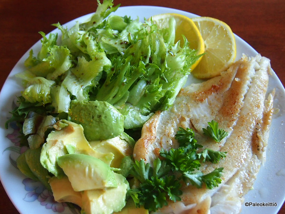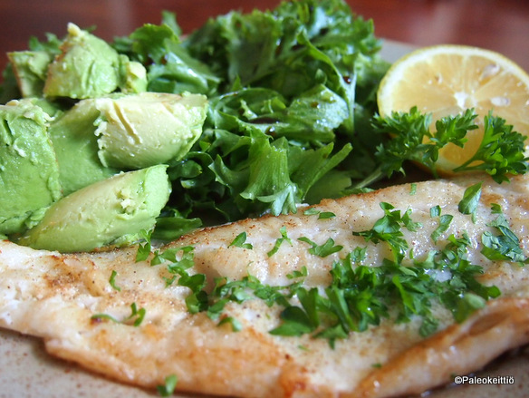 Kirnuvoissa paistettu kuhafilee sitruunalla, salaatilla ja avokadolla. Mausteena valkopippuri ja himalajansuola.
