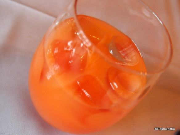 Itse toimin jälleen autonkuljettajana, joten alkoholipitoisia juomia tuli nautittua sen mukaan. Ystävälleni maistui hieman enempikin. Ja mikä siinä! Juhlapäivän kunniaksi. Aperitiivina lasissa greippimäinen tuoremehucampari. Jota kyllä maistoin. Ensimmäistä kertaa elämässäni. Harvinaisen hyvältä maistui. Vaikka oma juomapuoli rajoittuukin lähinnä viinien monipuoliseen ja ihmeelliseen maailmaan =)