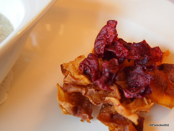 Annoksen ehdottomasti parasta antia olivat kuitenkin juuressipsit! Oooooh! Ohuita ja rapeita. Näitä olisi mennyt enemmänkin. Jos olisin oikein viitseliäs, niin valmistaisin näitä itse kotinaposteltaviksi. Lehtikaalisipsit ovat ihan ok, mutta näissä juuressipseissä on taikaa!