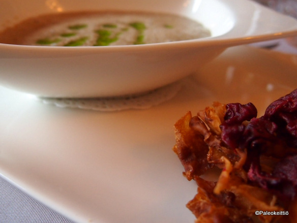 Ruoaksi valitsimme hiljattain syksyiseksi päivittyneen Kirkkonummi menun. Alkuruokana kermaista suppilovahverokeittoa ja juuressipsejä. En vieläkään voi väittää oppineeni syömään sieniä, mutta kermaisesta keitosta on helppo aloittaa. Näitähän tässä on jo maisteltu useampia. Korvasienikeitto lienee edelleen lempparini, mutta hyvää oli tämäkin. Ihanan täyteläistä! Kermaista. Kyllä!