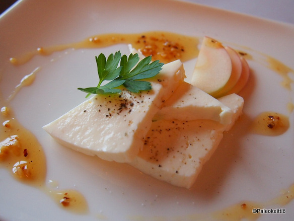 Väliruokana tarjoiltiin tällä kertaa Veikkolan kotijuustoa kera kotimaisten omenasiivujen ja pähkinäisen siirapin. Ehdottomasti parempi vaihtoehto omaan suuhuni kuin edellisten menuiden kurkkusorbetti. Vaikkakin pidin tästä juustosta enemmän paistettuna.