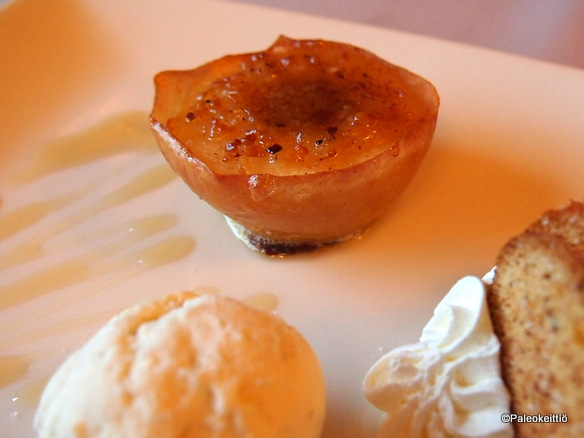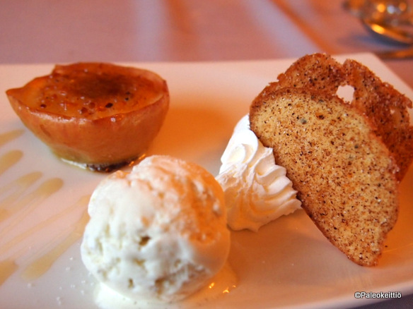 Jälkkäriksi syksyn varma valinta; uuniomenaa, aitovaniljaista jäätelöä, kermavaahtoa ja ohuen ohuita kanelikorppuja. Ei ehkä tajunnanrajäyttävä, mutta kokonaisuuteen istuva ja hyvä päätös aterialle.