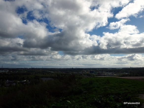 Sadonkorjuun jälkeen riitti vielä virtaa katsastaa muita paikallisia nähtävyyksiä. Matka huipulle on pitkä ja puinen. Ja huipulla tuulee! Maisemaakin riittää. Vaikka ei ehkä niin mun makuun katsella piippuja siellä ja tornitaloja täällä. Pääkaupunkikin jäi jotenkin etäiseksi (alakuva). Mutta tulipa tsekattua ja sykettäkin nostatettua. Hiipimällä. Ehkä vielä joku päivä tempaisen portaat ylös ihan urheilumielellä! Jos sen vielä joskus jostain löydän…