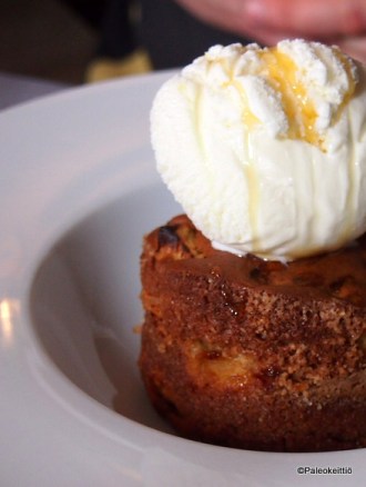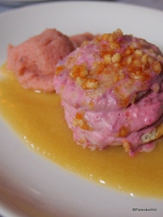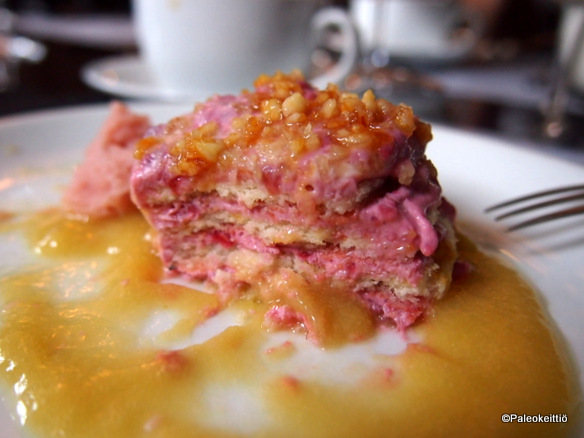 Jälkkäriksi valitsin itselleni pirtsakan ”vadelmakakkusen”, jota tarjoilija kutsui nimellä ”bisquit”. Keksiksi annos oli kuitenkin melko pehmeää… Kaverina muistaakseni raparperikastiketta, jolle on joku hienompi ja virallisempikin nimi ;). Kaverille myös raparperia. Toisenlaisen kakkusen muodossa ja kera vaniljajäätelön. Molemmat olivat oikein maukkaita.