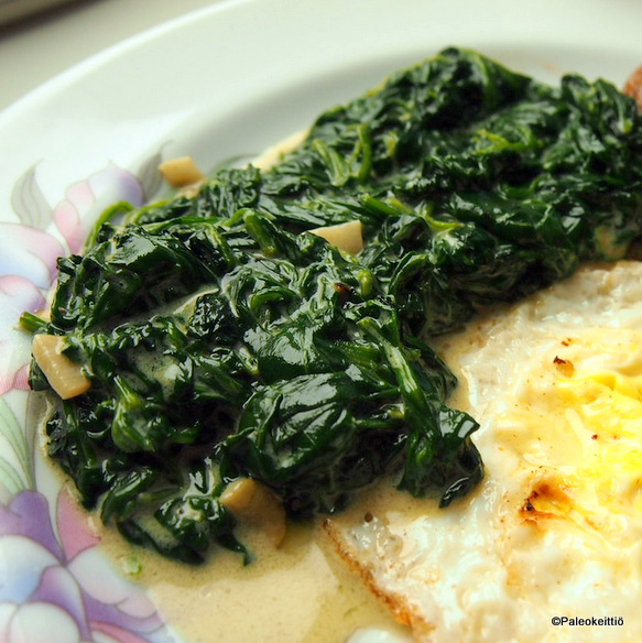 Itse olen hauduttanut pinaatin isohkossa teräskattilassa. Huuhdeltu pinaatti kun räiskii jonkin verran kuumaan rasvaan lisättäessä. Muitakin kelpovaihtoehtoja varmasti on, mutta näin meillä täällä Paleokeittiössä =). Parhaiten pinaatin kanssa toimii mun mielestä ehta meijerivoi, mutta näin TehoPaleolla olen tyytynyt kookosöljyyn, joka täyttää tehtävänsä aivan yhtä hyvin. Toimii myös kookoskermalla tai tavallisella terästettynä.