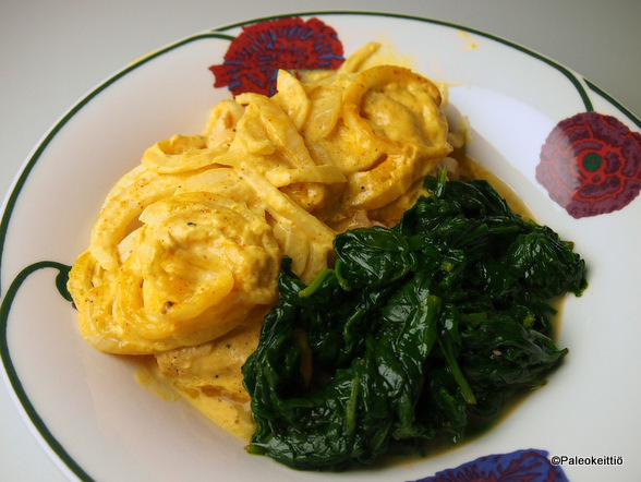 Peitä filee sipulirenkailla ja kaada päälle kookoskerma, johon on sekoitettu limetin mehu, chili, kurkuma, hunaja ja hippasen vielä suolaa. Tuikkaa koko komeus takaisin uuniin ja kypsennä 30-40 minuuttia. Jos olet viitseliäs ja pidät enemmän pehmeästä kuin crunchysta sipulista, niin sipuli kannattaa kuullottaa kookosöljyssä pannulla ennen uunia.