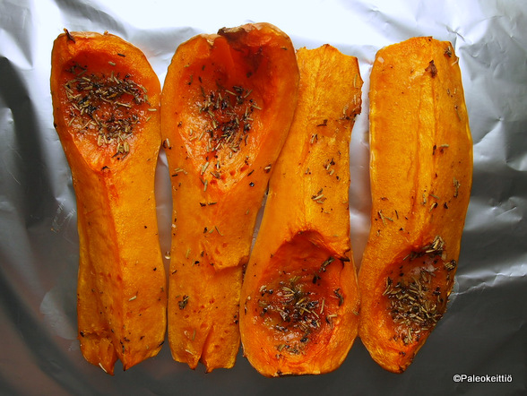 Sivelin kurpitsaveneet oliiviöljyllä. Ripottelin päälle kaikella rakkaudella suolaa ja mustapippuria, vähän timjamia, rosmariinia ja hunajaakin. Työnsin uuniin ja odottelin kurpitsalihan pehmiävän. Nautin kera uunikalkkunan. REALLY?! No en oikeastaan. Nauttinut, mutta söin kuitenkin.