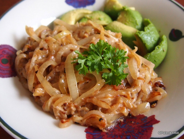 Jauhelihapihvin ja kermaisen sipulin liitto on miltei yhtä taivaallinen kuin mustaherukan ja mintun. Tavallisesti venytän paleorajoja sen verran, että haudutan kuullotetun sipulin kermassa. Niin juuri, siinä lehmän kermassa. TehoPaleolla piti kuitenkin olla tarkkana, joten korvasin kiltisti kuohukerman kookoskermalla. Hippasen olin maun suhteen ensin epäileväinen, mutta maistamisen myötä epäilyt hälvenivät kuin aamusumu kesäisessä auringonpaisteessa. Kookoskerma täyttää tehtävänsä loistokkaasti kerman korvaajana myös sipulin kanssa! Eihän se vaatinut kuin hitusen rohkeutta. Jatkan kookoksen viitoittamalla tiellä! Kokeile sinäkin! =)