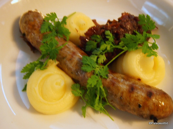 Tällä kertaa kuitenkin sain sitä mitä tilasin. Ja hieman enemmän, kun annokseeni ilmestyi täysin odottamatta muutama nokare perunasosetta. Karamellisoitua punakaalia oli kovin vähän, joten ehkäpä muusinokareet paikkasivat puutetta. Lihaa en uskaltanut valita aikaisempien ikävien kokemusten valossa, joten päädyin vasikanlihamakkaraan kera karamellisoidun punakaalin ja punaviinikastikkeen. Kastikkeen sain toivomuksesta erilliseen tarjoiluastiaan. Vasikanlihamakkara maistui kyllä. Samoin edelleen jumalainen mallasleipä. Ja mikäs sen mukavampaa kuin huuhdella makkara alas uusiseelantilaisella Pinot Noirilla.
