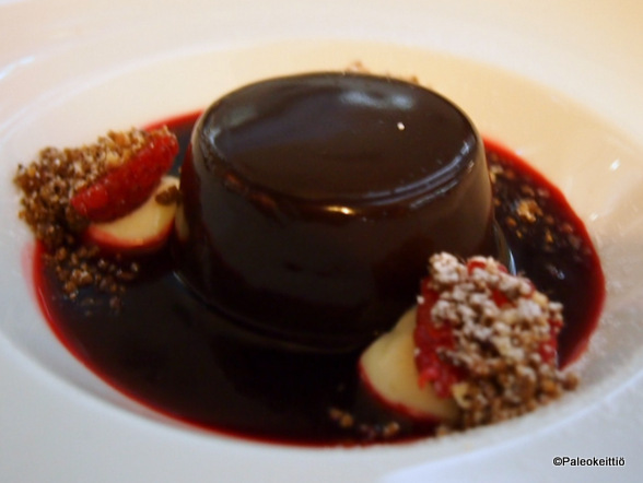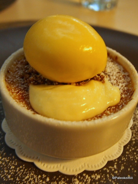 Skippasimme alkuruoat ja päätimme niiden sijaan panostaa jälkiruokiin. Ne kun jäivät viimeksi itseltäni syömättä. Suklaata on edelleen vaikea ohittaa, jos se vaan listassa mainitaan. Valitsin siis manjarisuklaamoussea marenkikeksillä ja kirsikkaliemellä. Marenkia en muista maistelleeni, mutta jos oikein pinnistää, niin meneehän se murustettu piparkakkukin marengista. Mukana oli myös vadelmaa ja valkoista. Valkoista en osaa tämän enempää valottaa. Kirsikkaliemi ei oikein iskenyt, eikä piparkakkukaan, mutta muuten mousse maistui kyllä. Käsittääkseni myös seuralaisen valinta vaniljainen creme brülee mandariinisorbetilla kelpasi. Ainakin kuppi tyhjeni. Nopeammin kuin oma lautaseni.