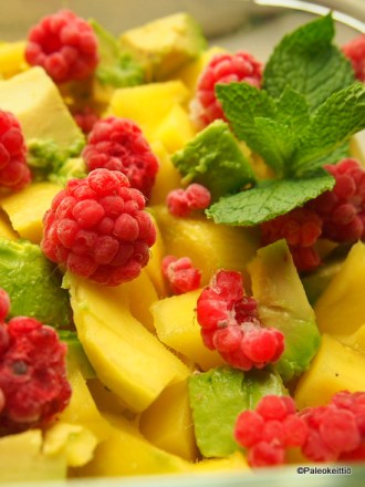 Minttukin oli tuoretta. Mango liiankin tuoretta; vähemmän mehua ja mössöä, mutta valitettavasti myös vähemmän auringon kultaa ja makeaa. Kaunista ennen kastikkeen kumoamista ja vadelmien vettymistä.