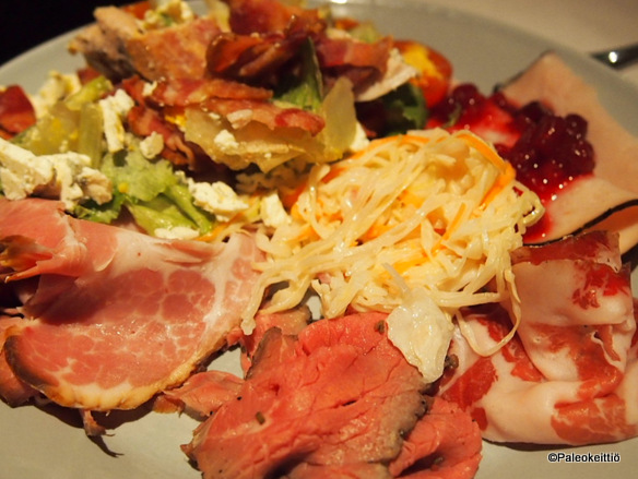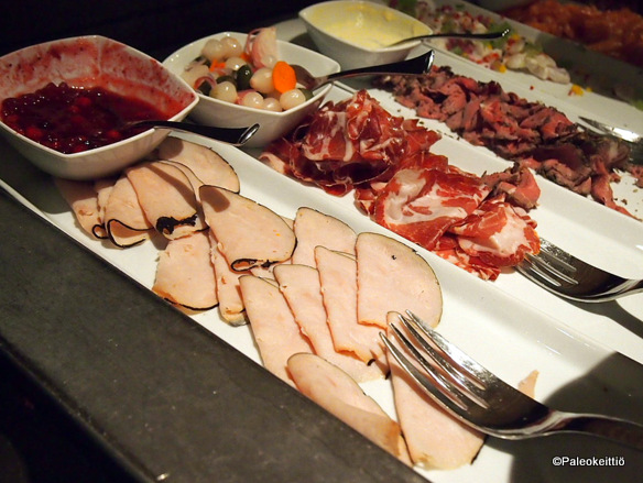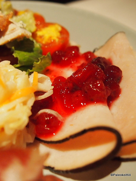 Lihalautanen oli aika tasainen. Lautasen kuningattareksi nimeäisin kuitenkin palvikalkkunan kera karpalohillokkeen. Olen kalkkuna ja karpalo ihmisiä. Pekoni on aina hyvää. Sopii arkeen ja juhlaan. Harmittavasti näköjään missasin naudanpaistin kaveriksi tarkoitetun piparjuurikastikkeen. Olisin pitänyt siitä aivan varmasti. Pidin ehkä viime vuonna.