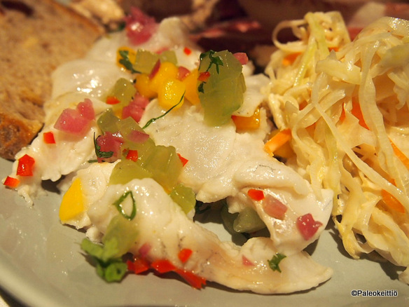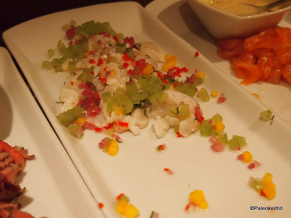 Jollekin muullekin oli maistunut ennakkosuosikkini, Klaus K:n Kuhaceviche. En tiedä oliko resepti eri vai alkaako muisti pettämään, mutta ei se ollutkaan niin hyvää kuin muistelin. Melko mautonta sanoisin. Olisin kaivannut enemmän jotain ”sitrusmaista”. Ehkä suolaakin…