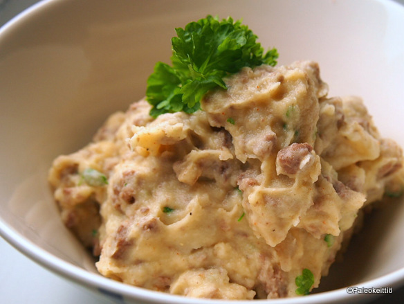 Vanhoja juttuhan tässä on taas yhdistelty uudeksi kokonaisuudeksi. Palsternakkapyre on tuttu miltei parin kuukauden takaa ja ”jauhelihasoselaatikko” bataatista ja kukkakaalista hieman kauempaa. Lihapalsternakkasose sopii sekä täys-, että semipaleoistille. Täyspaleotahan taikoo melkein ruoasta kuin ruoasta korvaamalla maitotuotteet kookoskermalla tai -maidolla. Nokare aitoa voita sallittakoon myös tiukkiksille ;). Jos pipo ei voita kestä, niin jälleen kerran voidaan palata kookoksen äärelle; kookosöljykin toimii. Melkein mihin vaan. Myös ulkoisesti.