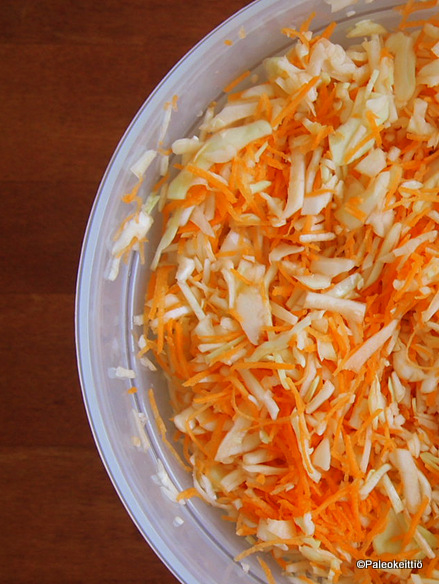 Mukaan valkokaalia raastettuna vaihtelevasti jotain 600 ja 900 gramman väliltä, ja homma sekaisin.