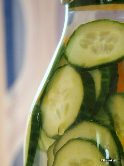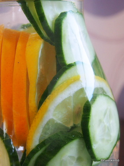 Suosi luomusitruksia tai pese tehotuotetut huolellisesti ruokasoodalla ja juuresharjalla. Viipaloi kurkku ja sitrukset (kuorineen). Purista mukaan myös päätykappaleiden mehu. Ujuta viipaleet lasipulloon tai -kannuun ja kaada vesi päälle. Anna maustua jääkaapissa. Nauti ja virkisty!