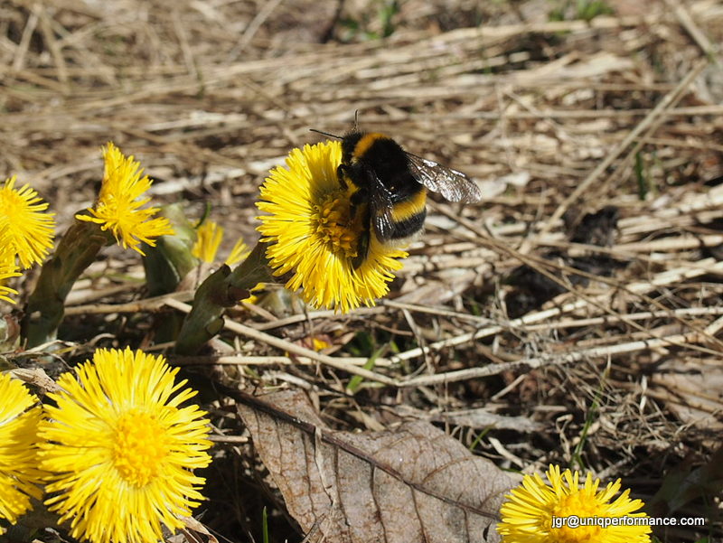 Viime vuoden lakastuneet heinät heiluvat hennosti tuulessa. Niiden lomasta pistää esiin pieniä vihreitä piikkejä.