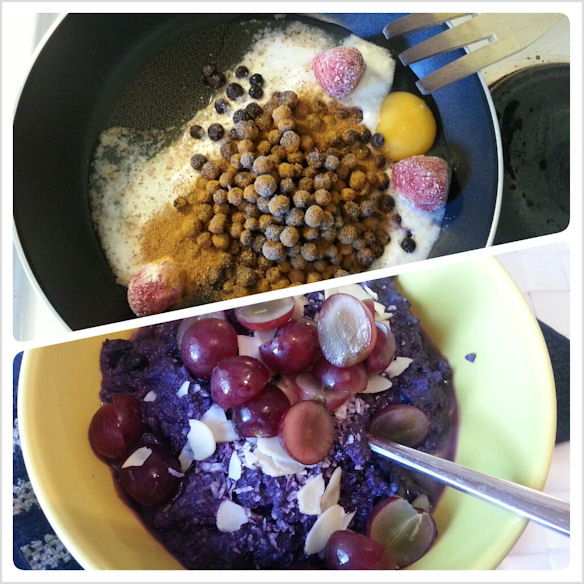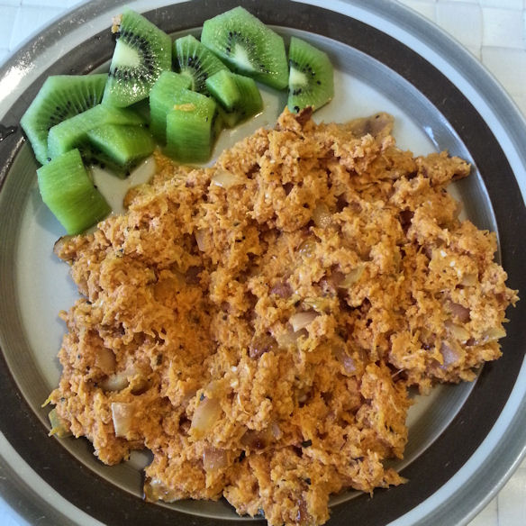• Lisää puuroon kookosjauhojen sijaan mantelijauhoja, ja banaanin sijaan pieneksi raastettua porkkanaa tai bataattia. Tällöin puuroon voi paistaa ensimmäisenä esimerkiksi sipulia kookosöljyssä ja eilisen kanan jämät. Tällöin pannu on kuitenkin kuuma, joten sille lisätään kaikki muut aineet ja viimeiseksi vasta munat, sekä ollaan nopeita :)
